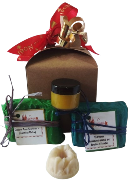 Le Coffret Peau Nette N°3 de Laurasis Beauté Créole est composé d’un : d’un savon Datyé, d’un savon dynamisant au bois d’Inde, d’un ongant Datyé et bois d’Inde + un petit savon de chez Laurasis Beauté Créole.